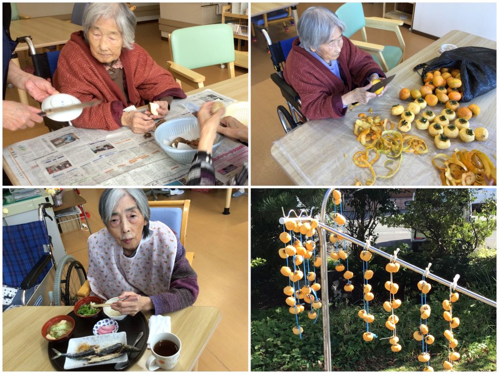 また、職員が自宅で収穫した柿を持参してくれたので、干し柿づくりにもチャレンジしました。カビないで甘くなることを祈ります!