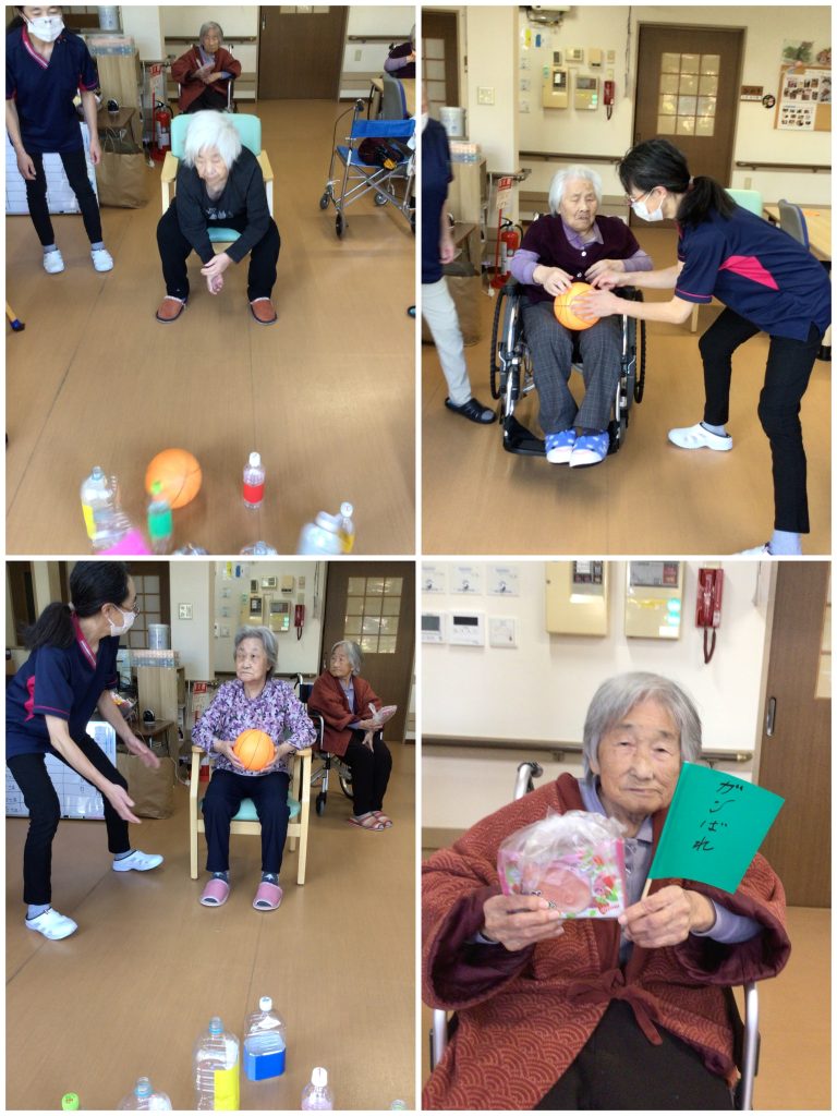スポーツの秋。定期的にレクリエーションを楽しんでいますが、スポーツの日にはボ-リング大会を開催しました。ストライクが出やすいようペットボトルの並べ方を大いに工夫しましたが、なかなか倒れず…ペットボトルは軽すぎるようでした。お菓子の景品があったので、楽しくも白熱した戦いとなりました♪